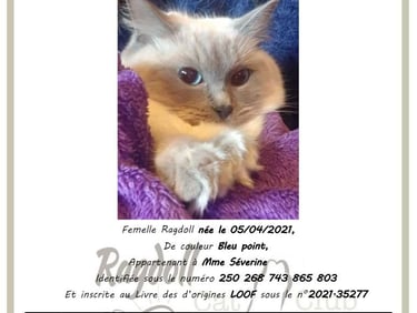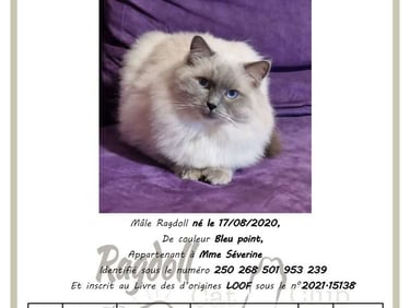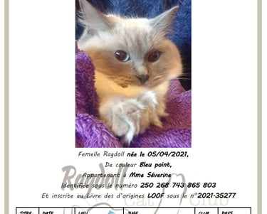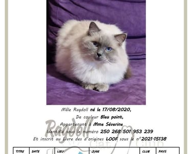 Dans chaque présentation, vous pouvez consulter le pédigré LOOF, les tests de santé et les résultats d'expositions de nos Ragdolls